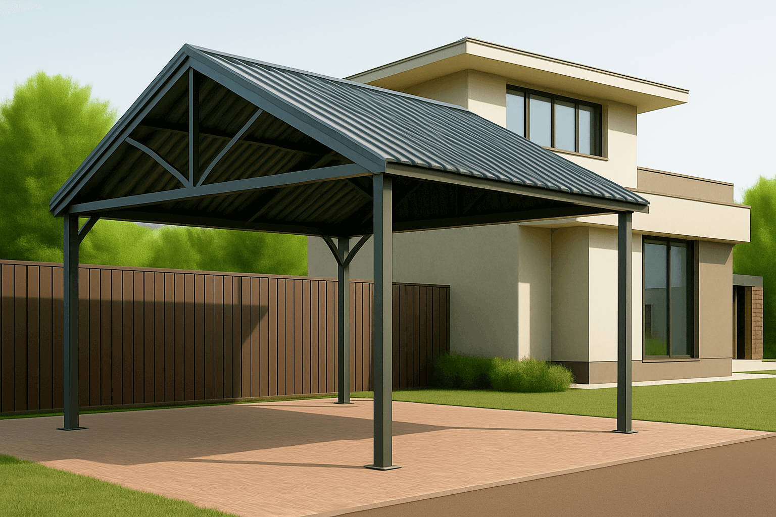 Каркас двускатного навеса обычно изготавливают из профильных труб 40x20 или 60x40 мм с антикоррозийным покрытием либо из алюминиевого профиля. Кровельное покрытие выполняют из монолитного или сотового поликарбоната, профнастила, металлочерепицы или сэндвич‑панелей с утеплителем. Поликарбонат обеспечивает светопропускание и УФ‑защиту, профнастил и металлочерепица — максимальную надежность при длительных осадках, а сэндвич‑панели — дополнительную тепло- и звукоизоляцию.