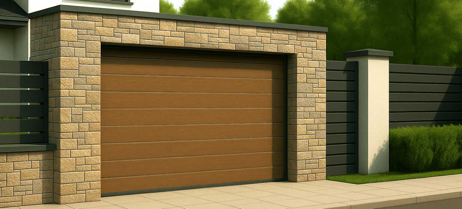 Секционные ворота состоят из нескольких горизонтальных панелей, соединенных петлями, оснащенных торсионными пружинами и роликами для движения по направляющим. При открытии ворота поднимаются вверх и размещаются под потолком, не занимая место перед гаражом, что является удобным и экономичным решением.