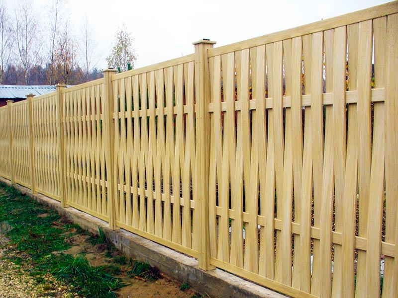 Деревянный забор «Плетенка» (вертикальная) представляет собой ограждение, где деревянные планки переплетаются вертикально, создавая плотную и узорчатую структуру.